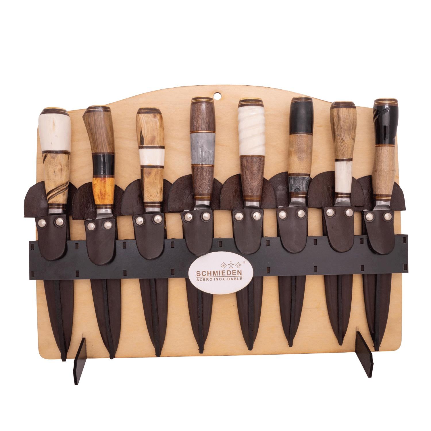 Exhibidor Con 8 Cuchillos Encabados En Cabos Surtidos Madera Acrilico Hueso