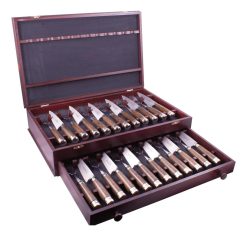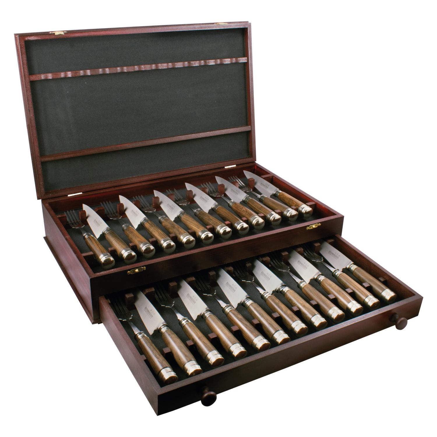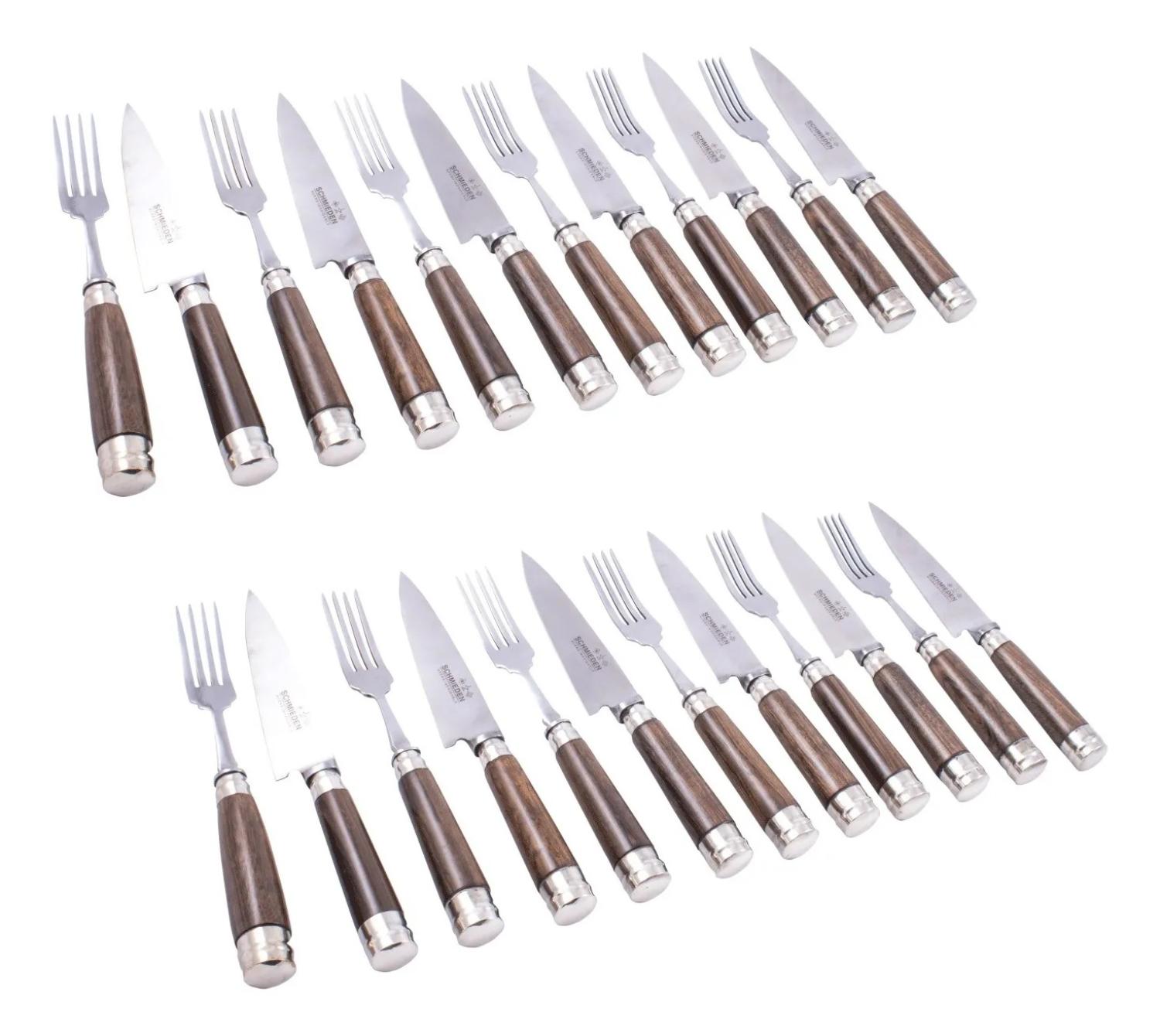 Juego De Tenedores y Cuchillos En Acero Inoxidable 14 cm Por 24 Unidades Encabados Madera Y Alpaca Con Caja De Madera Forrada En Pana