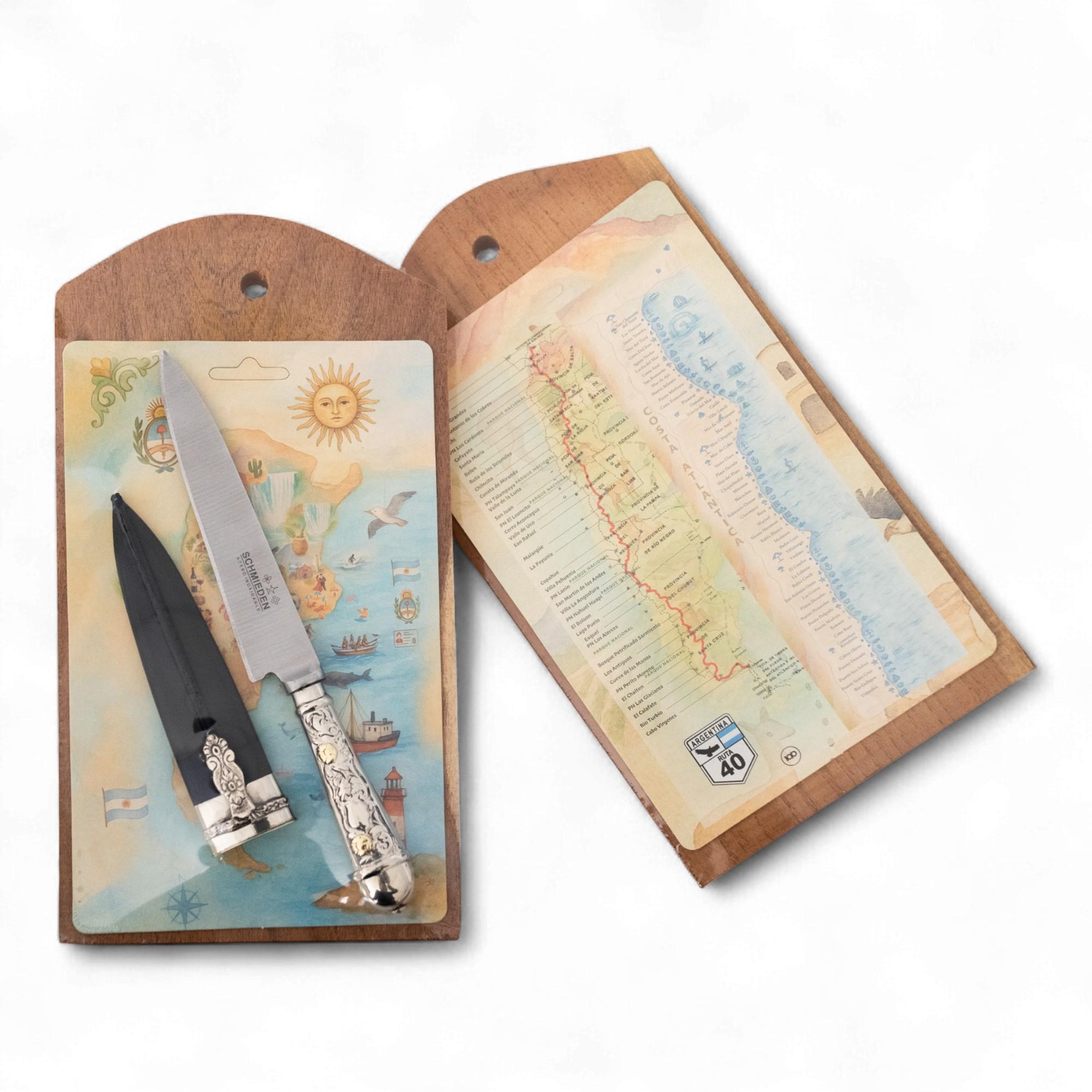 JUEGO DE TABLA Y CUCHILLOS ALPACA LABRADO HOJA DE ACERO INOXIDABLE 14 CM