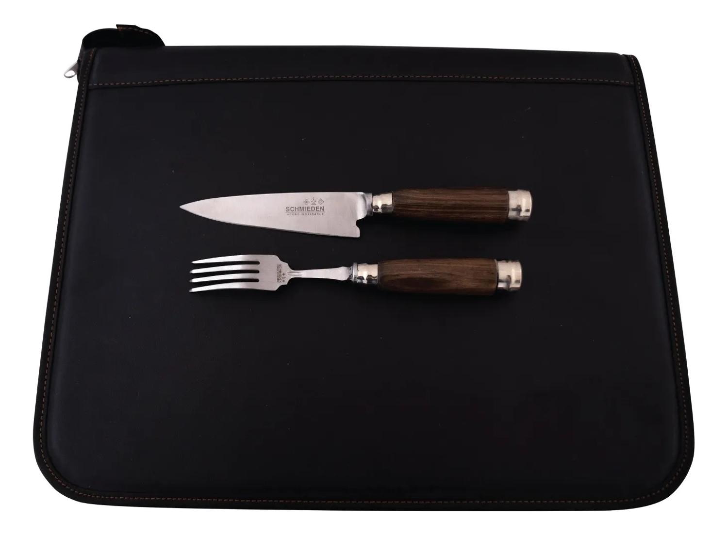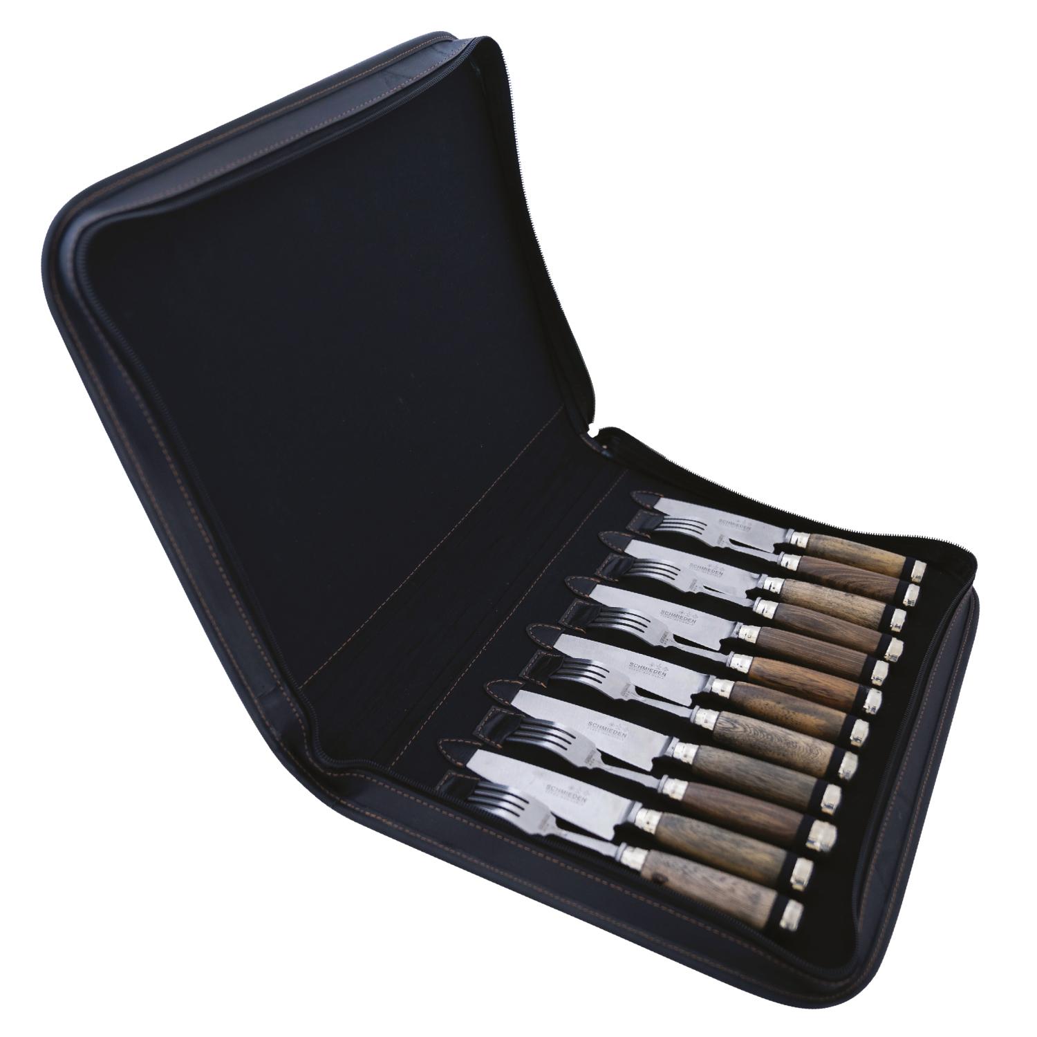 Juego De Tenedores y Cuchillos En Acero Inoxidable Por 12 Unidades Encabado en Madera y Alpaca Con Estuche En Cuero